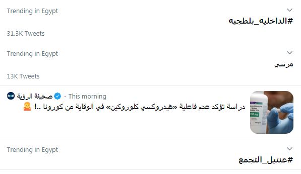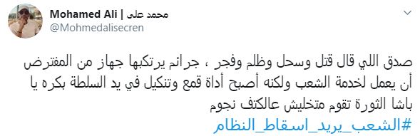 تصدر هاشتاج #الشعب_يريد_إسقاط_النظام إلى جوار هاشتاجي #الداخلية_بلطجية ة#كلنا_عويس_الراوي ضمن الأعلى تداولا على "تويتر" في مصر وسط دعوات للتظاهر الجمعة 2 أكتوبر في "التحرير" أكبر ميادين العاصمة القاهرة، بعد أسبوع حافل بتظاهرات القرى والأزقّة المعارضة للسيسي، والتي خرجت ترفض السيسي عدو الله وتطالبه بالرحيل، وبالتراجع عن قرارته بهدم المساجد والمنازل.