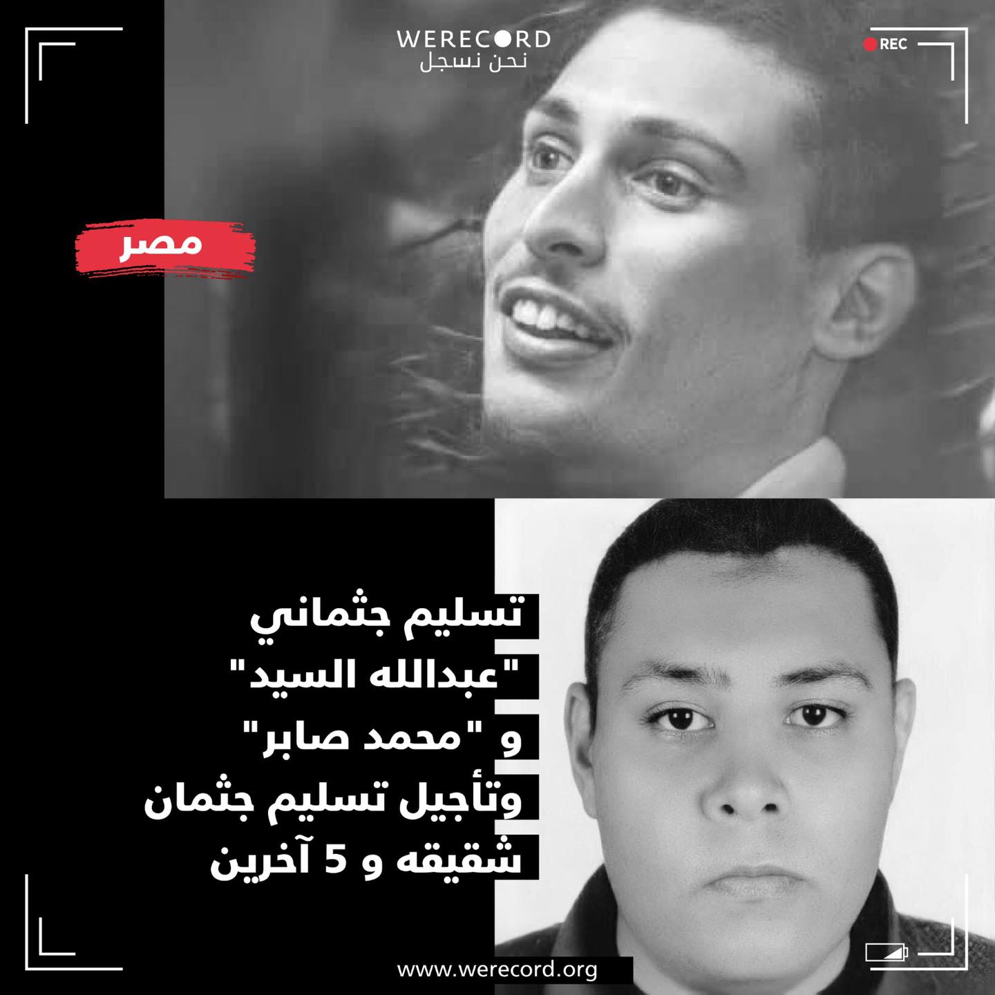 قال فريق نحن نسجل الحقوقى إن وزارة الداخلية بحكومة الانقلاب سلَمت أمس الأربعاء جثماني محمد صابر وعبد الله السيد، ورفضت تسليم جثمان محمود صابر شقيق الأول، مُرغِمة والديهما المُسنيّن على فتح المقابر مرتين، وتذوّق ضِعف الألمِ، ليمرّا بنفسِ المشاهد ويتضخّم هول الموقف.