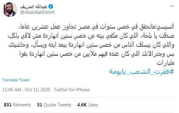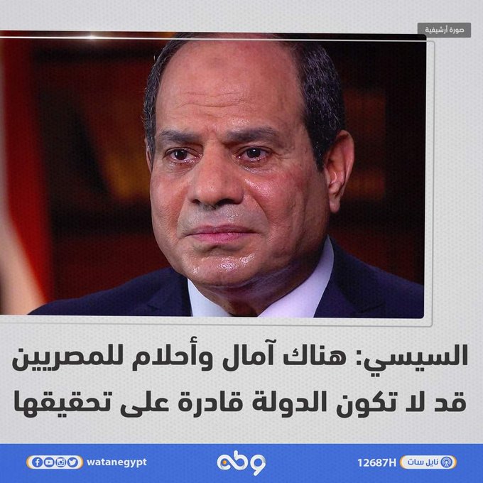وقال ناشط أن أحلام المصريين وطموحاتهم بات لا يستطيع تحقيقها السيسي وينسب العجز للدولة.