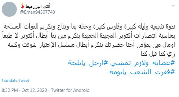 12 ألف تغريدة اليوم الاثنين حافظت على تصدر هاشتاج #فقرت_الشعب_يابومة لليوم الثاني على التوالي، ردًا على تصريحات السيسي المتكررة، وتفاخره بحجم إنجازاته المزعومة، وآخرها أمس الأحد بالندوة التثقيفية للقوات المسلحة التي طبلت لها الأذرع والكتائب كثيرا. ورأى الناشطون أن السيسي بحديثه الذي لو حمل على المعنى السلبي لوافقه تماما، ولكنه فتح الباب أمام الإهانات الجديدة.