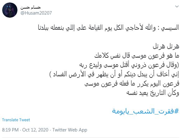 واعتبر "احمد" أن السيسي يندرج تحت ما ذكره الله "قال تعالى "زين له الشيطان سوء عمله فرآه حسنا، هو شايف نفسه بيرضى ربنا حسبنا الله ونعم الوكيل وعند الله تجتمع الخصوم"، وتحدث مغردون عن الغرامة المفروضة على محطات الطرق (الكارتة) وآحرون تحدثوا عن جباية الملصق الإلكتروني.