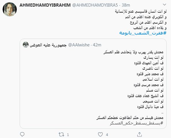 وأضاف الدكتور بحساب"@True51992728" ، "الله يفقره وأهله وكل من يدعمه #فقرت_الشعب_يابومة"، وكتبت "حورية وطن"، "باب الزنزانة ورفيق الحبس وانا ذنب بلادى حريه و عدل و كرامة انداست وداسوني وراااها أخدونى رهينة حبسوني بغدر وقالولي بلادك مش حمل الفجر #الحقوهم_قبل_ميعدموهم".