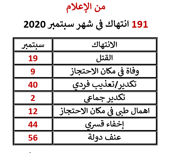 كان أرشيف القهر الذى يعده مركز النديم قد رصد 191 انتهاكا خلال شهر سبتمبر المنقضى بينها 44 جريمة إخفاء قسرى و56 جريمة عنف للدولة و40 جريمة تكدير وتعذيب فردى و2 من جرائم التعذيب الجماعى فضلا عن 19 جريمة قتل ووفاة 9 مواطنين داخل مقار الاحتجاز و12 حالة للإهمال الطبى داخل السجون.
