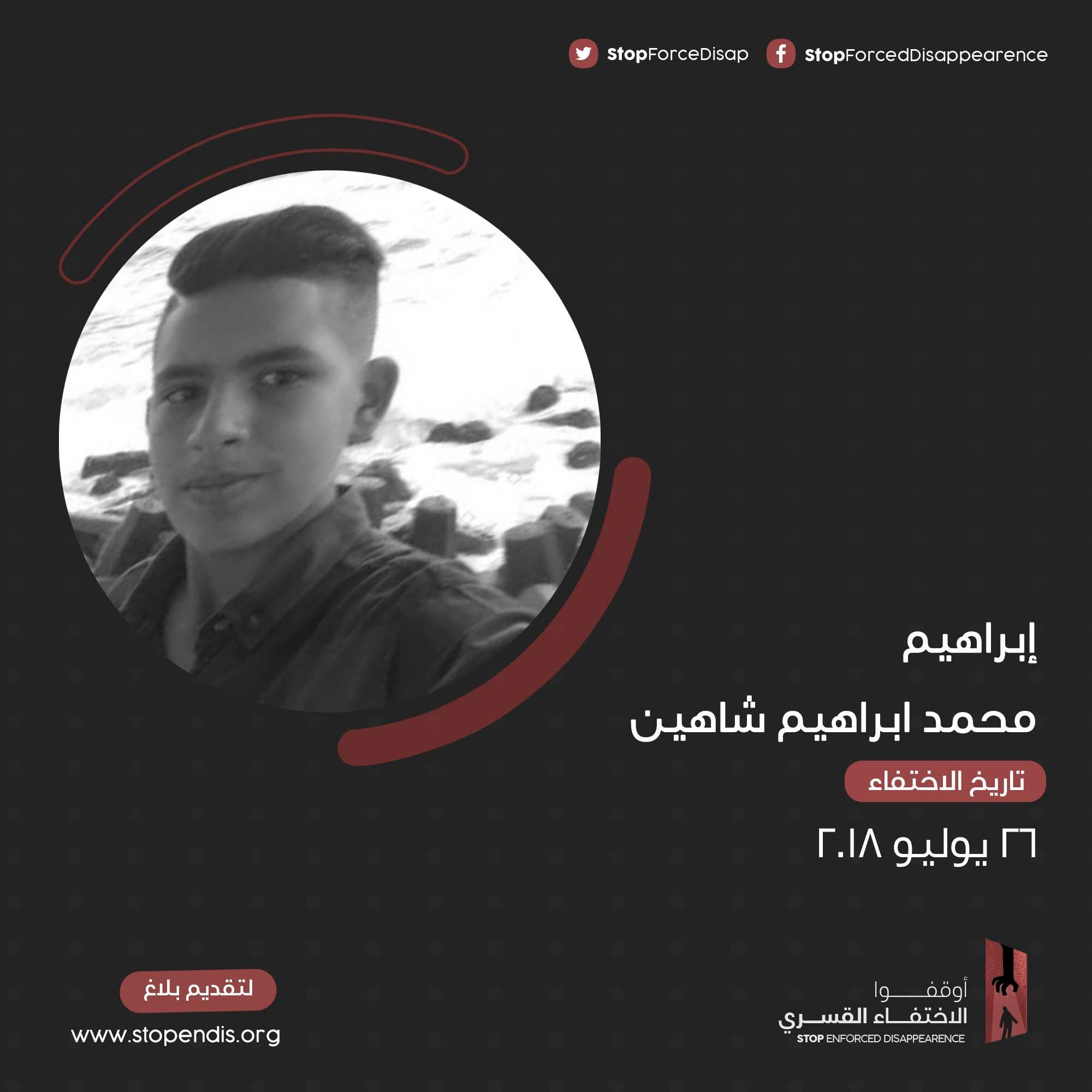 لا تزال قوات الانقلاب تخفى الطفل "إبراهيم محمد ابراهيم شاهين " 14 سنه من أبناء العريش بشمال سيناء ضمن جرائمها ضد الإنسانية التى لا تسقط بالتقادم. واختطفته ميلشيات الانقلاب يوم 26 يوليو 2018 كما تم اعتقال والدته واصطحبتهما لقسم ثان العريش ومنه للأمن الوطني حيث مكثوا 5 أيام حيث تم التحقيق معهما. ومن ثم الإفراج عن الأم وحدها ومنذ ذلك التاريخ لا يعلم مكان احتجازه رغم البلاغات والتلغرافات للجهات المعنية بحكومة الانقلاب دون اى تعاطٍ معهم.