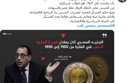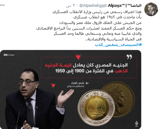 وعن تراجع قيمة الجنيه غرد صاحب حساب الباشا: هذا اعتراف رسمي من رئيس وزارة الانقلاب العسكري بأن ماحدث في ١٩٥٢ هو انقلاب عسكري من الجيش على الملك فاروق ملك مصر والسودان ومع حكم العسكر الممتد لعشرات السنين بدأ التراجع الاقتصادي والذي عانينا منه ونعاني وسنعاني طالما وجد العسكر في الحياة السياسية والاقتصادية..