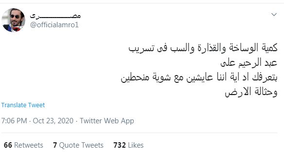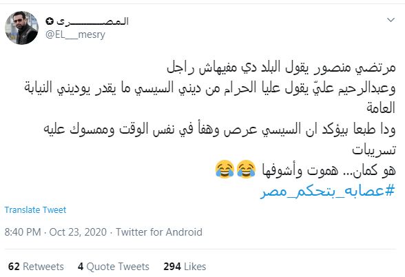بعد تداول ناشطين تسريبا صوتيا للكاتب المقرب من النظام عبدالرحيم علي، متحدثا مع زوج ابنته ماجد منجد، القاضي بمجلس الدولة، يسب خلاله السيسي والقانون والدولة ويهين وزارة الداخلية، تصدر هاشتاج #عصابه_بتحكم_مصر الأعلى تداولا على "تويتر" بنسبة تغريد هي الأعلى في وقت قليل.