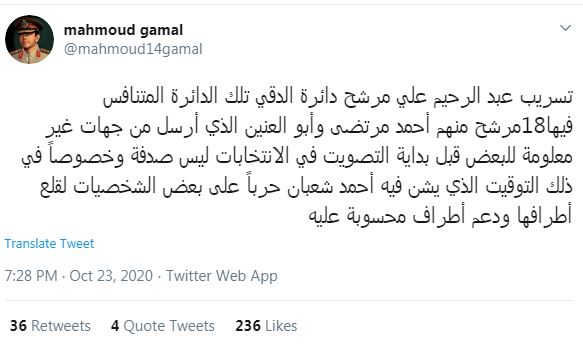 وأضاف الناشط الطلابي أحمد البقري "عبدالرحيم علي النائب في البرلمان والمرشح على قائمة المخابرات للدورة الجديدة يعبر عن واقع #مصر الان.. جهاز أمني سرب له هذه المكالمة والتي تحتوي على بذاءات وانحطاط.. شاهدوا نخبة السيسي".