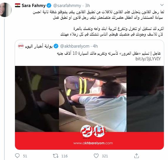 وقالت "زهرة اللوتس: "طفل يصدم أمين شرطه ساله عن الرخص والكمامة.. العيب علي أمين الشرطة.. مفروض دا طفل تحت السن لا إثبات ولا رخصة المفروض، كان قفل الطريق وصادر السيارة لحد ما ييجي سيادة اللوا أبو الطفل ويمرمغ بكرامة أمين الشرطة واهله الأرض.. وياخد الباشا الصغير ويروح" التغريدة السالفة كتبتها أمس واليوم حدث ما توقعته!