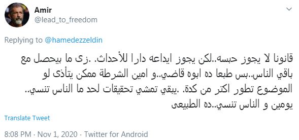 ولكن "Amir" أمير رد عليه قائلا "قانونا لا يجوز حبسه.. لكن يجوز إيداعه دارا للأحداث.. زى ما بيحصل مع باقي الناس.. بس طبعا ده أبوه قاضي.. وأمين الشرطة ممكن يتأذى لو الموضوع تطور أكتر من كده.. يبقي تمشي تحقيقات لحد ما الناس تنسى.. يومين والناس تنسى.. ده الطبيعى".