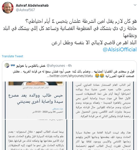 تصدرت عدة هاشتاجات مساء الأحد على "تويتر" تتعلق بمنظومة العدالة في ظل الانقلاب العسكري وهي #ابن_القاضي و#أمين_الشرطة و#النائب_العام على فترات خلال اليوم بعد أن قررت "النيابة العامة إخلاء سبيل الطفل صاحب واقعة إهانة شرطي المرور، مع تعهد والده بإخضاعه لجلسات تعديل سلوك، وإخلاء سبيل صديقه الذي صور الواقعة بكفالة 10 آلاف جنيه!