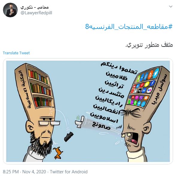 وأردف “دين السلام” أو “the religion of peace “، “بجانب مقاطعة المنتجات الفرنسية ، يجب اتباع السنة وإحيائها ، يجب أن نتحد ونتوقف عن اتباع الأعراف الأوروبية التي لا تتطابق مع هويتنا الإسلامية ، إنه النصر الحقيقي”.