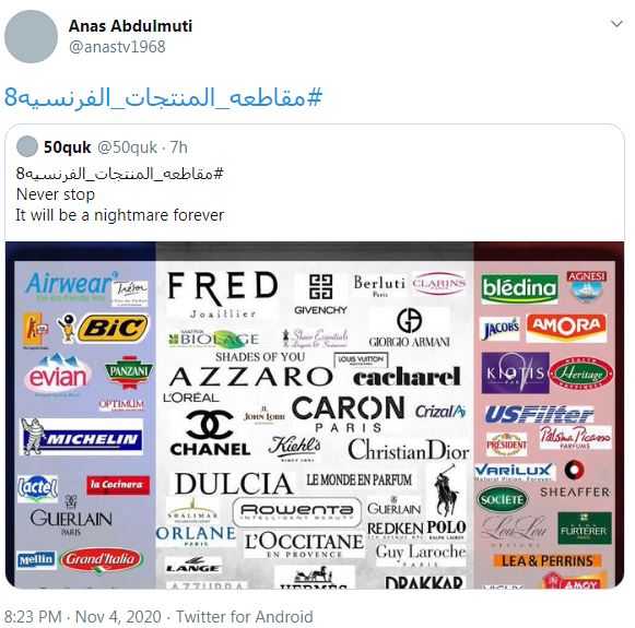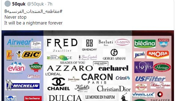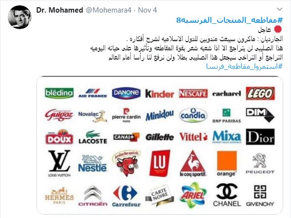 رفضًا للإساءة للرسول الله الكريم ﷺ، كشف ناشطون أن المقاطعة مستمرة لم تتوقف وذلك بالتغريد عبر هاشتاج #مقاطعة_المنتجات_الفرنسية8 الذي تصدر موقع “تويتر” بالتزامن مع التظاهرات المستمرة أيضا في أنحاء العالم الإسلامي.