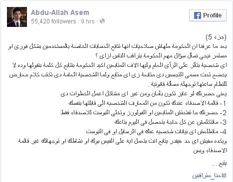 وكتب عاصم عبر صفحته على موقع "فيس بوك": "فى كلام كتير خرج ان الحكومة المصرية بتراقب الحسابات بس يا ترى الكلام ده صح او هما يقدرو يعملو كده فعلا ؟!"