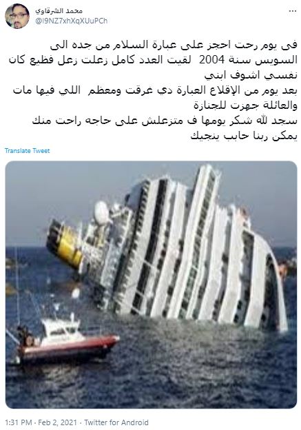 وعلق سامي "@sami99ksa"، "اذكر المأساة. عبارة السلام كانت قديمة ومليانة أعطال ومع ذلك سمحوا لها تنقل ركاب وفوقها القبطان لف السفينة جهة الأعشاب المرجانية. الله يرحم شهداء الحادث ويغفر لهم".