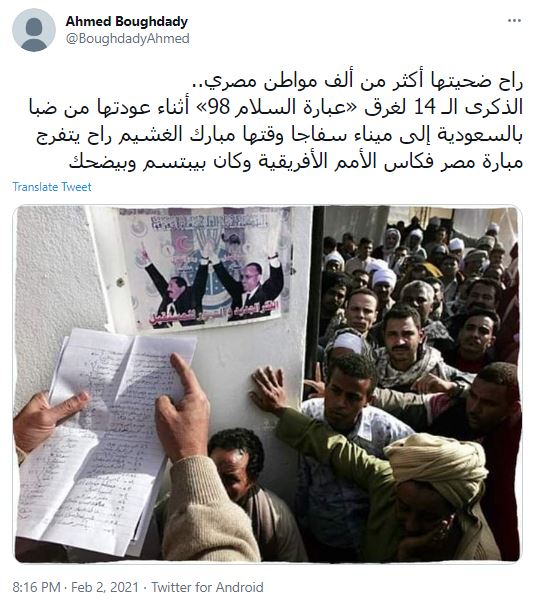 وأضافت ولاء "@tayel_walaa"، "راح ضحيتها أكثر من ألف مواطن مصري الذكرى الـ١٥ لغرق #عبارة_السلام_٩٨ أثناء عودتها من ضبا بالسعوديه إلى ميناء سفاجا".