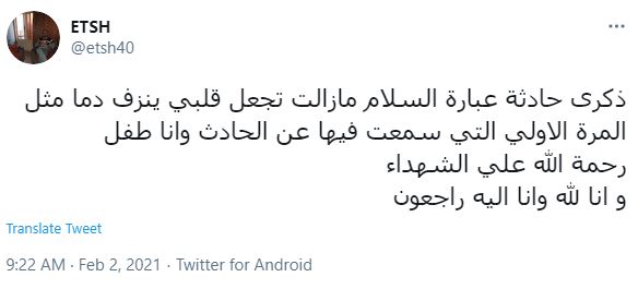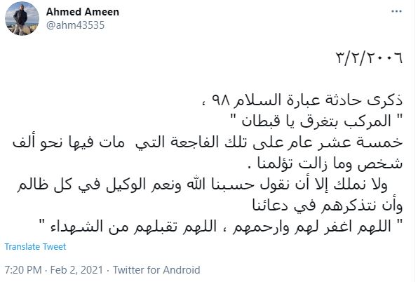 وعلق حساب "@etsh40" قائلا: "ذكرى حادثة عبارة السلام مازالت تجعل قلبي ينزف دما مثل المرة الأولي التي سمعت فيها عن الحادث وأنا طفل.. رحمة الله علي الشهداء.. وإنا لله وإنا إليه راجعون".