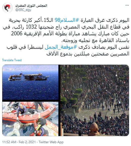 وأضاف ناشط: "قد كنت تبخل بالسكن واليوم تبخل بالكفن.. ماذا أصابك يا وطن؟"، في يوم 2 فبراير، منذ نحو 14 عاما، غرقت عبّارة "السلام" نتيجة جشع حكومة المخلوع مبارك، والإهمال الذي يخيم على عالم جمهورية العسكر".