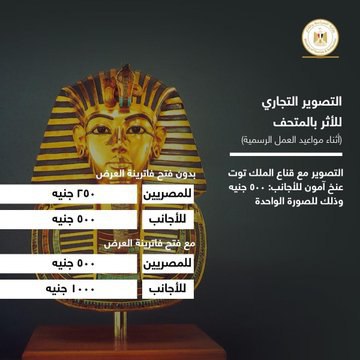 التصوير مع قناع توت عنخ أمون بدون فتح فاترينة العرض.. للمصريين: 250 جنيه، للأجانب:500 جنيه.