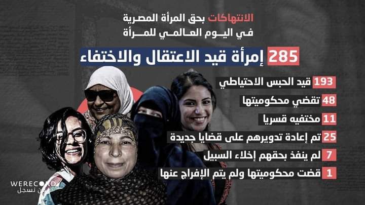 وقالت حركة "نساء ضد الانقلاب" إن عدد السيدات المعتقلات بالسجون حاليا 169 فتاة وسيدة، بين ما يزيد عن ألف معتقلة إضافة إلى عشرات الشهيدات.
