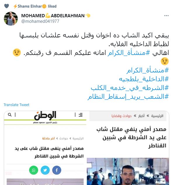 الإعلامي أحمد عطوان علق قائلا: "نظام #السيسي مستاء من بيان أممي حول إهدار حقوق الإنسان في #مصر .. ومن أجل تقديم الدليل على أنه يراعي الحقوق والواجبات الإنسانية للمصريين قام ضابط شرطة بمركز #شبين_القناطر بقتل شاب يعمل في محل للدواجن بضربه بكعب مسدسه حتى لفظ أنفاسه بقرية #منشأة_الكرام ..#الداخليه_بلطجيه".