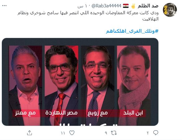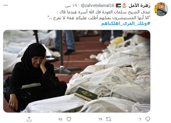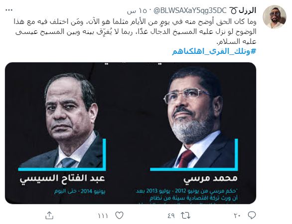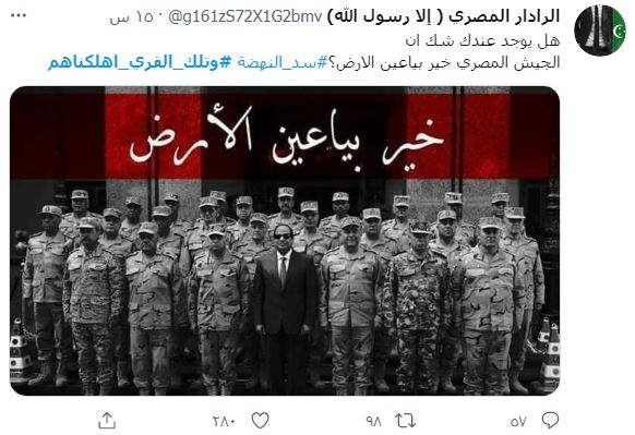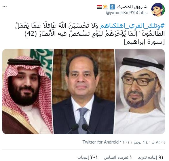 وكتب حساب "الرادار المصري ( إلا رسول الله)" @g161zS72X1G2bmv "قاتل الله طاغية مصر #السيسي على جرائمه .. اللهم من أراد بعبادك الأحرار في سجون الطاغية في مصر كيدا فاجعل كيده في نحره.. اللهم كن لعبادك عونا وفرّج عنهم وانتقم من جلاديهم… وسيعلم الذين ظلموا أيّ مُنْقلَبٍ ينقلبون".
