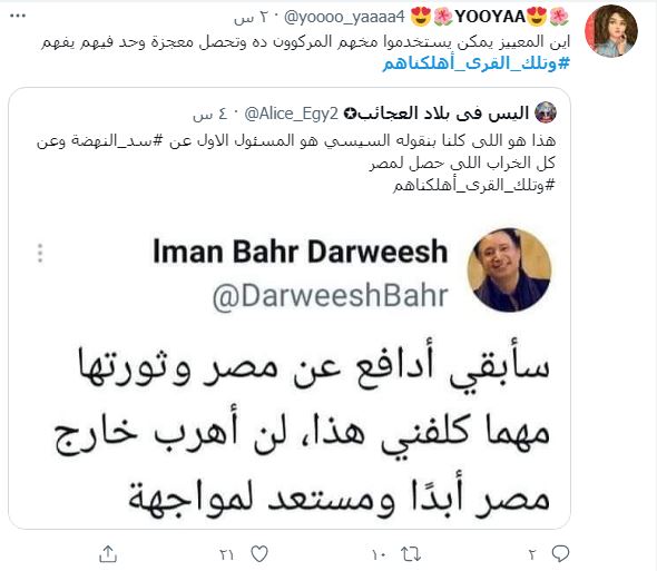 أمل خطاب @Esf__3 رأت أنه "في يوم قريب قوات الأمن .. ستلقي القبض على السيسي.. بتهمة الاستيلاء على المال العام.. بعد تمكنه من صرف وسرقه.. من أموال القروض.. لمدة ٧ سنوات بـ مصر.. وصندوق تحيا_مااااسر اللي تحت إيده ولا يخضع لـ أيّ رقابة ..".