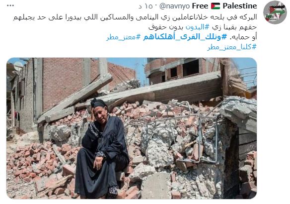 أما "مصري والدم فلسطيني" @rpawerr فكتب عن حلقة من الظلم بإخفاء الأدلة "اللي حرق المجمع العلمي هو اللي حرق مجلس الدولة هو اللي بيبيع أرضها وغازها وميتها ،وإهدر كرامتها وجعلها مسخرة الأمم".