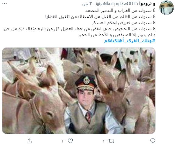 "بـ 15 ألف تغريدة على الأقل"، تصدّر هاشتاج #وتلك_القرى_أهلكناهم بعدما زاد الظلم والاستبداد من الانقلاب وعصابته، وهو بحسب الناشطين دليل أن غرقه قريب ،وعمق غاطسه سحيق فشعر بخطر الوجود، فسارع إلى قشة الحديد والنار؛ ليستمر قليلا قبل السقوط .
