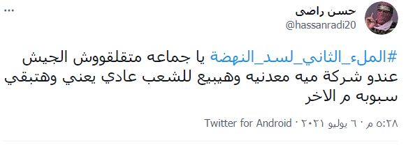 ويضيف د. أحمد رامى الحوفي @5DTPD3jcWuc9RUN فيقول: "عدم ضرب #سد_النهضة ليس له إلا معنى واحد (الجيش أصبح وسيلة للحفاظ على السلطة وليس للحفاظ على الدولة).".