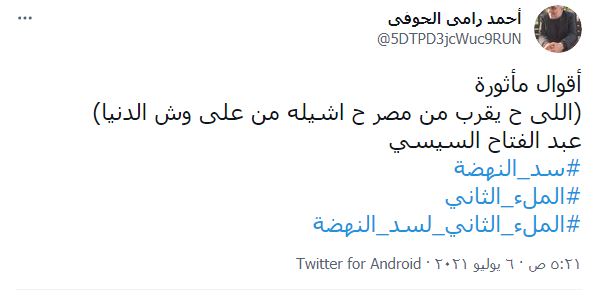 وخلص إلى أن "باذن الله سيكون #الملء_الثاني_لسد_النهضة نهاية إما للسيسي أو آبي أحمد وكلاهما ديكتاتور قاتل وقذر".