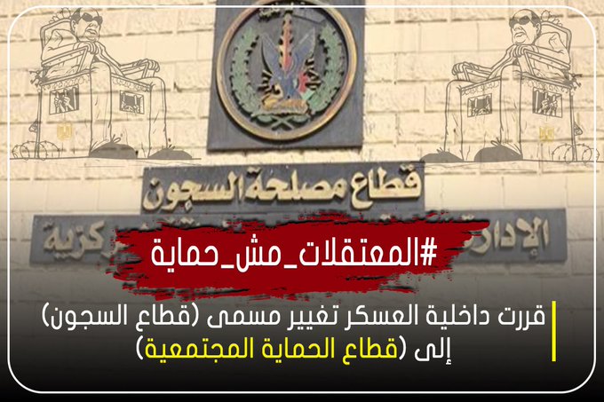 تصدر هاشتاج #المعتقلات_مش_حماية بعدما قررت داخلية الانقلاب تغيير مسمى (قطاع السجون) إلى (قطاع الحماية المجتمعية)، في محاولة منها لإخفاء الجرائم التي ترتكبها بحق كل المسجونين لاسيما أصحاب المحبوسين على ذمة آرائهم ومعارضتهم، فبات تغيير المسمى يشابه تغيير مسمى "الخمور" إلى "مشروبات روحية" بحسب الناشطين.