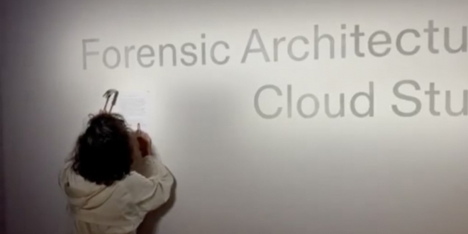 وعند مدخل المعرض، كانت ملاحظة معلقة تقول "معرض Forensic Architecture يقف مع فلسطين، ويدين العمليات العسكرية الإسرائيلية في غزة والتطهير العرقي للفلسطينيين".