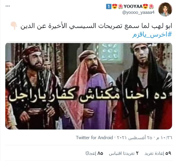 تصدر هاشتاج #اخرس_ياقزم منصة تويتر بمصر بعد مطالبة المنقلب السفيه عبدالفتاح السيسي، بإعادة النظر في المعتقد الديني؛ وإسقاط صفة "المُصلح" على نفسه ووصفه أن الإصلاح عمل الأنبياء والرسل، مؤكدا ما سبق من مزاعمه أن الدين (الإسلام) يحتاج إلى خروج منه لرؤيته بشكل أوضح (نقدي) من الخارج في الوقت الذي يجعل الجيش غير مسموح بالحديث عنه باعتبار أنه "مؤسسة مغلقة وحساسة" فضلا عن اعتباره أن حديثه (ترهاته) لا يأتيه الباطل فيردد على نمط "ما تسمعوش من حد غيري" ألوانا مشابهة.