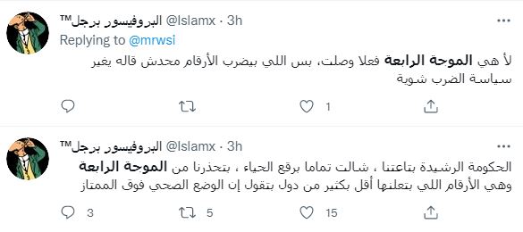 وحذر إسلام بشرى @IslamBoushra من الموجة "سترك يا الله … الرهان على وعي الناس رهان خاسر لابد من تدخل الحكومة بعودة الإجراءات الاحترازية وغلق جميع أماكن التجمعات والتفتيش على الماسكات بجميع الكمائن والتوعية بضرورة التطعيم حتى نخرج من الموجة الرابعة بخير وأقل الخسائر".
