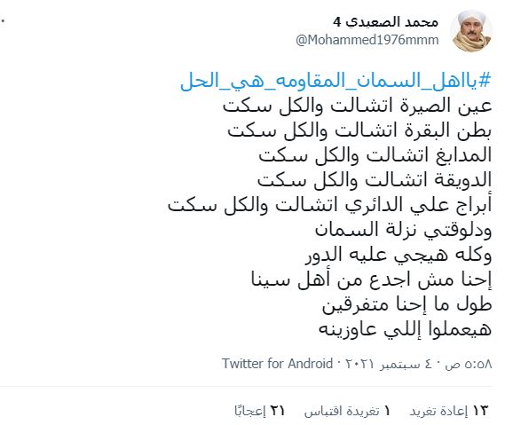 بطن البقرة اتشالت والكل سكت .. المدابغ اتشالت والكل سكت .. الدويقة اتشالت والكل سكت .. أبراج على الدائري اتشالت والكل سكت.. ودلوقتي نزلة السمان .. وكله هيجي عليه الدور.. إحنا مش أجدع من أهل سينا .. طول ما إحنا متفرقين..هيعملوا إللي عاوزينه".