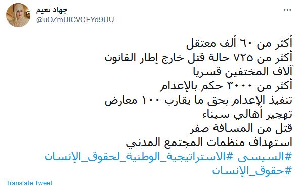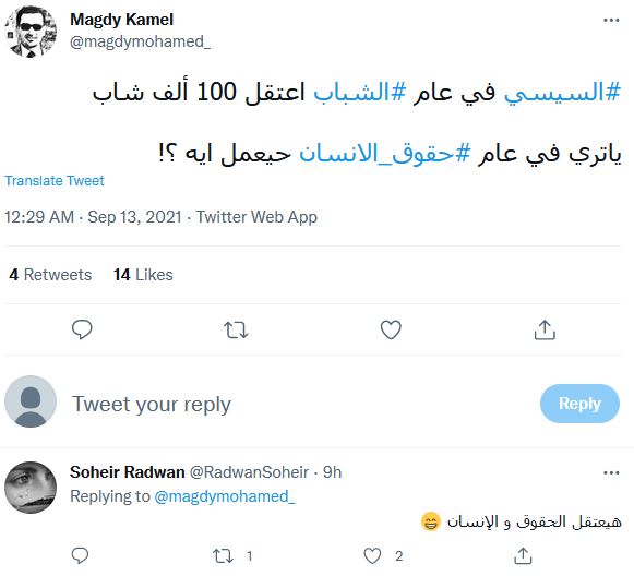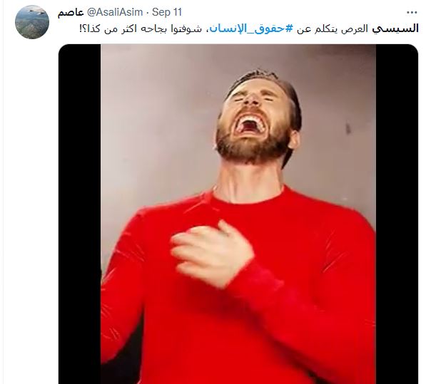 وعلق مجدي كامل @magdymohamed_ ساخرا "مرة واحد اسمه #السيسي حابس نص الشعب ومجوع النص التاني ومرفعه بالسلاح وقتل أجانب بالتعذيب حتى الموت.. بيقولك حيعمل عام ل #حقوق_الإنسان في مصر".