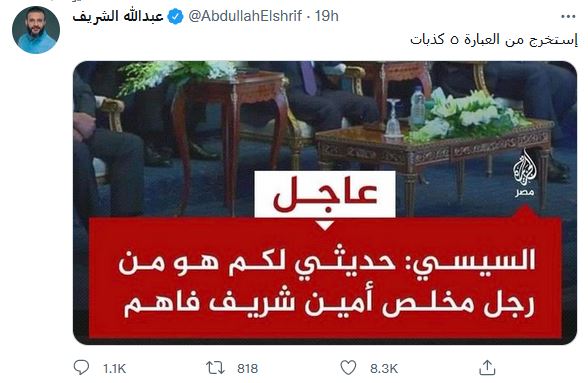 أسامة إبراهيم سجل عبر @Specoss عدة ملاحظات حول ما أدلى به المنقلب وقال في واحدة من تغريداته "لقد تم هدم أركان #الدولة_المصرية بجميع أطيافها وفئاتها وأصبحت في يد مؤسسة تنفيذ واحدة هي الخصم والحكم والعمل والإنتاج، والدولة بكل ما فيها تابعة لهم، ولم تمر مرحلة بهذا السوء على #مصر مثل هذه المرحلة التي يعيشها الناس الآن".
