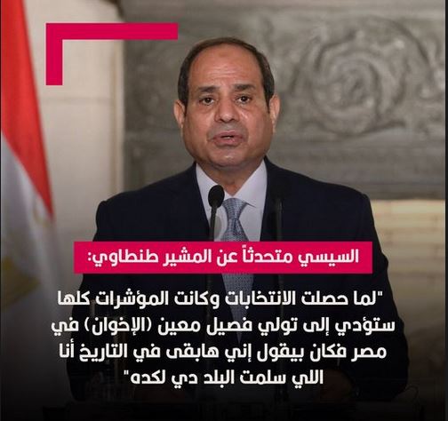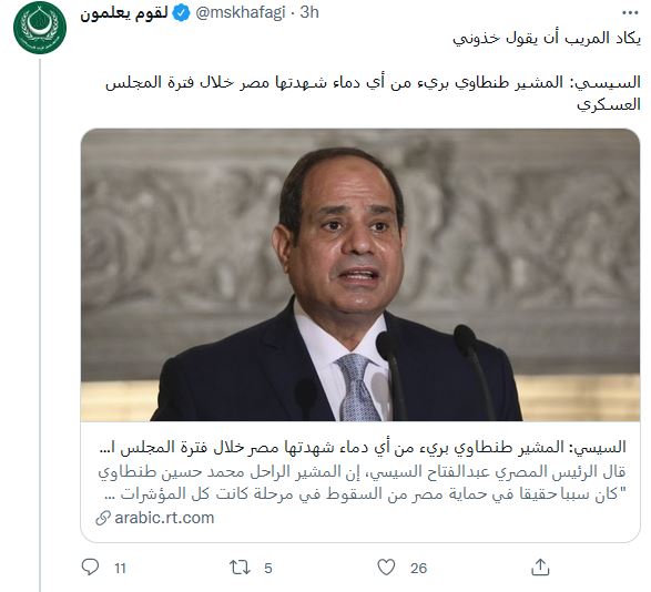 وكتبت هاجر @hagar30448579 "السيسي يقول إن طنطاوي حزين، لأنه هيسلم البلد للي اختاره الشعب بالانتخابات، العسكر لا يعترفون باختيارات الشعوب، ويعتبرون أنفسهم أوصياء على الشعب، يختارون لهم ويحكمونهم وينهبونهم ثم يقتلونهم".