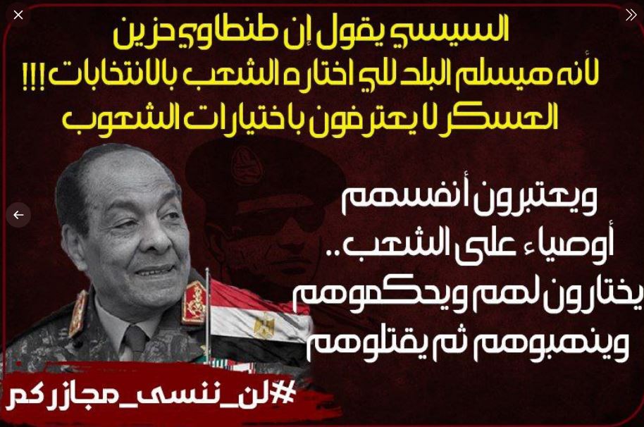 تصدر هاشتاج #لن_ننسى_مجازركم منذ رحيل المشير محمد حسين طنطاوي وزير الدفاع الأسبق ورئيس المجلس العسكري الحاكم منذ فبراير 2011 وحتى يوليو 2012، وجاء الهاشتاج ردا على ما صرح به السيسي وهو يتحدث عن "طنطاوي"  "لما حصلت الانتخابات وكانت المؤشرات كلها ستؤدي إلى تولي فصيل معين (الإخوان) في مصر فكان بيقول إني هابقى في التاريخ أنا اللي سلمت البلد دي لكده" وهو ما اعتبره الناشطون اعترافا من السيسي بتأكيد المؤامرة على الثورة وعلى جماعة الإخوان المسلمين وأن السيسي شريك طنطاوي بمذابح قبل الثورة و"بطل" مذابح ما بعد الانقلاب.