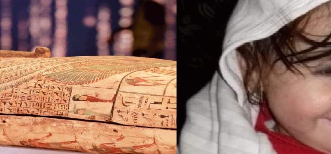 التابوت الذي عثر عليه في منطقة سقارة الأثرية مصنوع من الخشب الملون على شكل آدمي، مزين بقلادة كبيرة من الأزهار تنتهي برأسي صقر، ومن تحتها نقوش فرعونية تحمل نصوص القرابين.