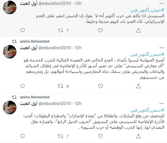 حساب أول الغيث @education2010 هو الآخر غرد عدة تغريدات وقال في واحدة منها إن "السيسي ليس معنيا بحرب أكتوبر ومن شاركوا فيها، لأنه لم يشارك بها، لذلك لا يستمد شرعيته منها بل يستمدها من القوة ومن توافقات دولية وإقليمية".