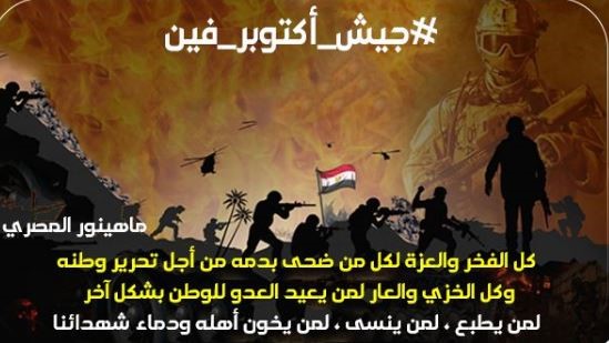 أما مغرد الثورة @KhawaterAhmad فكتب "#جيش_أكتوبر_قتله_السيسي .. باع نفسه للشيطان.. انقلب على رئيسه..خان العهد والأمان.. قتل الثوار الأحرار.. دمر الاقتصاد عنوة.. فرط في الثروات.. باع الأرض والغاز.. الآن شغال سجان.. نفذ ما طُلب منه جيدا..
