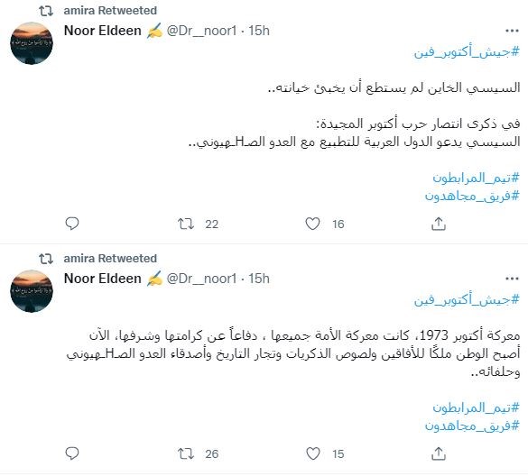 وأضافت في تغريدة تالية "لم يستطع أن يخبئ خيانته في ذكرى انتصار حرب أكتوبر المجيدة .. السيسي يدعو الدول العربية للتطبيع مع العدو المحتل".