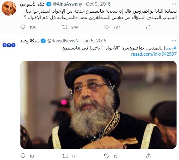 وتعليقا على صمت الكنيسة أضاف "يوافق اليوم الذكرى العاشرة ل #مجزرة_ماسبيرو.. 28مصريا قتلهم العسكر في 9 أكتوبر 2011
