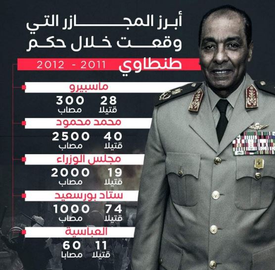 واستعرضت أَمّ فَاطِمَة @Fatima_____12 صورة تجمع طنطاوي بمجازره أثناء فترة حكم المجلس العسكري والتي نفذها مدير المخابرات الحربية عبدالفتاح السيسي وقال "دي الحقيقة اللي الناس مش هتنساها ولا حد هيقدر يزور التاريخ ، الراجل ده ارتكب كل المجازر دي هو والسيسي والقادة العسكريين اللي كانوا موجودين وقتها، دم الناس دول في رقبتهم والقصاص أكيد هيجي في يوم من الأيام".