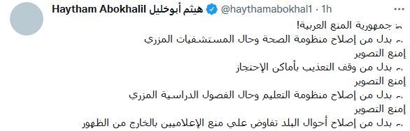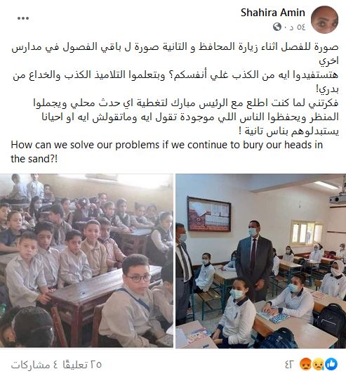 وأضاف العضو السابق بالمجلس القومي لحقوق الإنسان أسامة رشدي عبر @OsamaRushdi: "منع التصوير في المدارس وقبلها المستشفيات والمحاكم والشوارع وتجريم ذلك.. هي مشكلة #السيسي مع الصورة التي هي عنوان الحقيقة التي يريد طمسها وإخفائها.