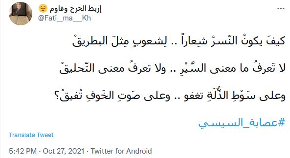 وتساءلت حورية وطن @hory_zky عن فئة معينة "بعد عسكرة مفاصل الدولة في كل المناصب المدنية التنفيذية ..أين من صرخوا ولطموا وطال عويلهم بمصطلح "أخونة الدولة"؟
