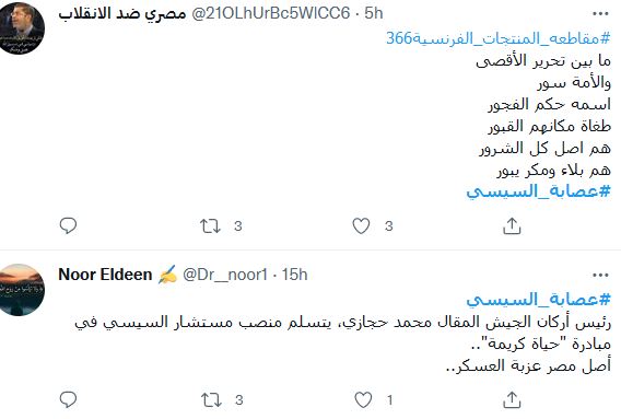 تفاعل ناشطون على مواقع التواصل الاجتماعي مع هاشتاج #عصابة_السيسي، بعدما رصدوا تعيين أحد الفاسدين بسرقة المال العام المخصص لتنمية سيناء -الفريق أسامة عسكر- رئيسا للأركان، وتعيين من شغل المنصب لمدة عامين بمنصب رئيس مبادرة السيسي حياة كريمة في إبدال مواقع كما في لعبة الكراسي الموسيقية.