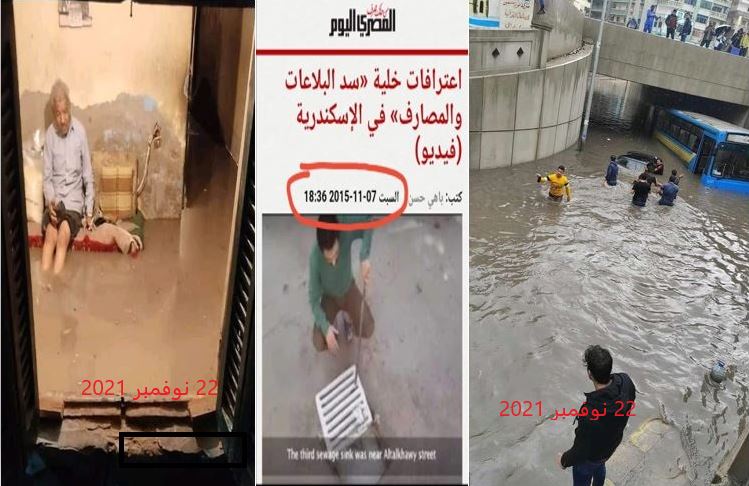 رغم أنها مصيبة لا يتمنى المصريون استمرارها، إلا أن الأمطار التي هطلت على محافظة الإسكندرية، صباح الاثنين 22 نوفمبر، ساهمت وتراكمات الأمطار التي لم يتم معالجة آثارها، في الكشف عن فساد متجذر، صنعه الانقلاب عندما ترك معالجة الأسباب التي تغرق الإسكندرية بشكل موسمي واتهم جماعة الإخوان بسد البالوعات!