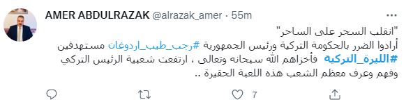 وكتب الصحفي السوري موفق هارون @MUAFFAK94 “الذي استطاع أن يوقف انقلاب #15_تموز بمكالمة فيديو لم تتجاوز الدقيقة، ورفع #الليرة_التركية بنسبة 20% خلال ساعتين، واستطاع أن يفرض هيبته على الجميع، يستحق أن يكون رئيس دولة قوية مثل #تركيا تحارب نصف العالم، إنه الرئيس التركي رجب طيب أردوغان”.